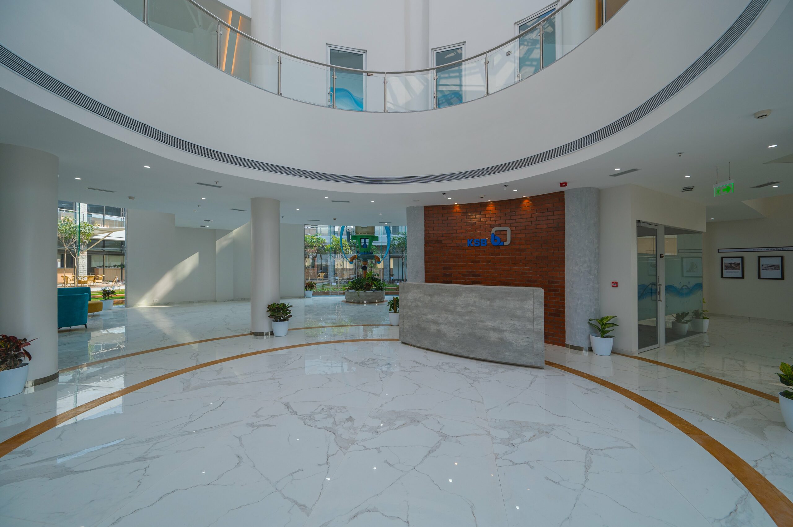 The approach to designing the workspace for KSB Pumps in Shirwal stems from an understanding of cutting-edge concepts and envisioning the workplace of the future. “Our scope was to design all interior spaces, public spaces, the main dome and certain landscapes for two buildings, namely the administration block, the training and guest house block” clarifies Kadam. Both add up to an interior development area of 40,000 sq ft.