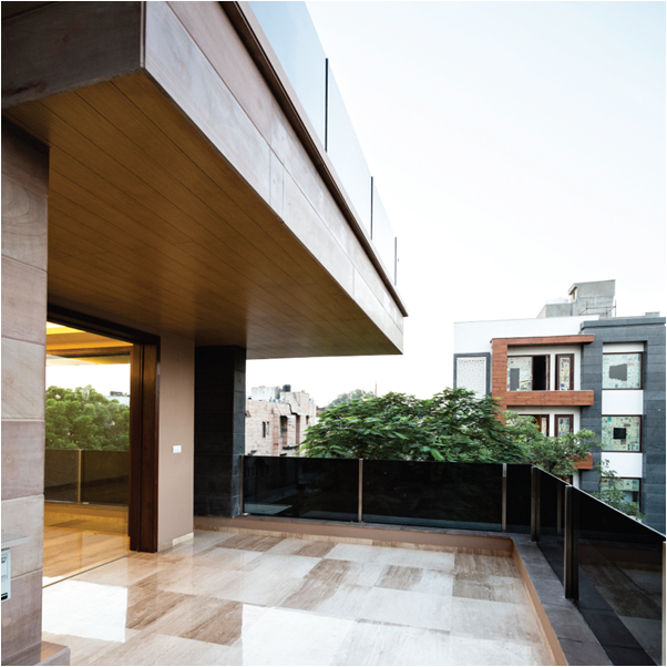 This strategy helps bring light deep into what is essentially, a narrow thin building. The deep recesses for the windows and large overhangs temper the fierce climate of Delhi and recall sustainable building traditions, while allowing for views from within. Two local stones, are used to emphasize the cubic volumes that give this house its name and form its most distinctive visible element.