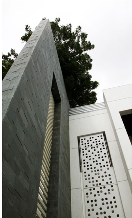 The structure is bisected by a wall that physically demarcates space as well as influences the character of the interior spaces. Due to the narrowness of the plot, the wall house was conceptualized as a linearly planned structure partly bisected by a 34 feet high wall that also forms the main exterior façade of the house and is its main focal element-The Wall. This wall is clad with raw, unfinished kota, a stone indigenous to the Rajasthan region. The play of sunlight on this uneven surface creates interesting patterns of light. This wall runs through much of the interior spaces and influences the character of these spaces.
